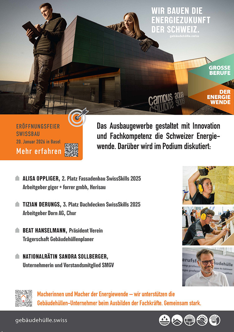 Vom historischen Globus Basel zum Vorzeigebeispiel nachhaltiger Sanierung: Die Eröffnungsfeier der Swissbau 2026 zeigt, wie das Ausbaugewerbe mit Innovationsgeist und Fachkompetenz die Schweizer Bauwende gestaltet – und diskutiert, was es dafür an Talenten und Unternehmergeist braucht. Gebäudehülle Schweiz und ihre Gebäudehühlle-Profis leisten einen wertvollen Beitrag dazu. An dieser Feier sind wir im Podiumsgespräch wie folgt präsent: